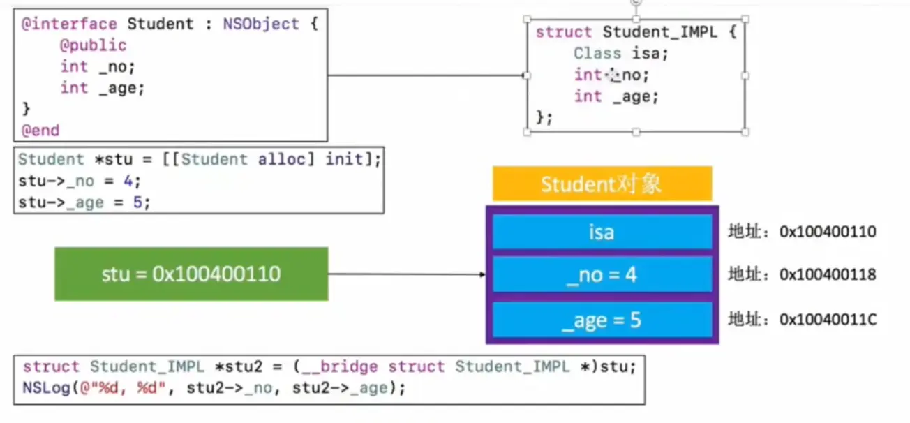 Person类继承自NSObject,包含一个成员变量_age,Student类继承自Person,包含一个成员变量_no,一个Person对象和一个Student对象所占用的内存空间均为16。