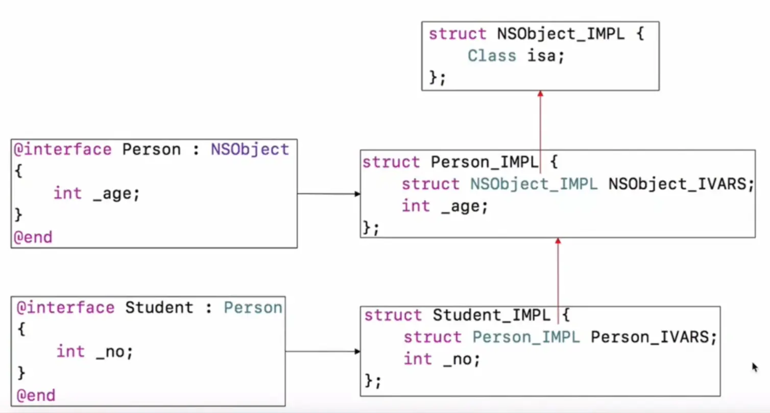 再细致一点讲,系统给一个Person对象分配了16个字节的内存空间,他的父类的结构体的实现也就是isa指针占用了8个字节的你内存空间,_age占用了4个字节的内存空间。系统给一个Student对象按照“规定”也同样分配了16个字节的内存空间,Person结构体的实现占用了Student全部的内存空间,但是Person还有4个字节的内存空间没有利用,所以把这4个字节分配给了Student的_no成员变量。