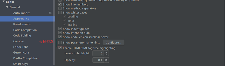 按照老版本依次打开File→settings→ Editor → Appearance 配置页,将 Show parameter name hints 选项的勾选去掉即可。
