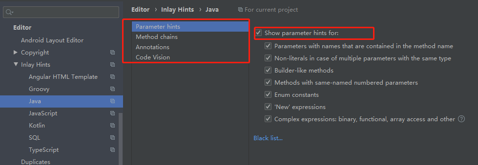 然后通过查找发现是配置项换位置了,IDEA依次打开File→settings → Editor →Inlay Hints →java ,根据个人喜好 在 Show parameter name hints 选项中灵活配置即可。新版对该功能做了更好的优化,并且做了更细粒度的配置。