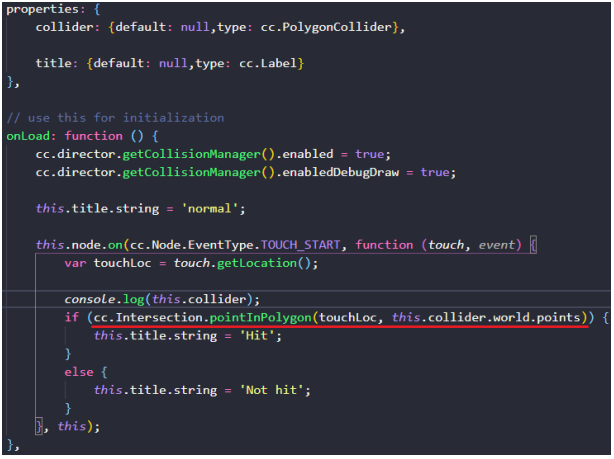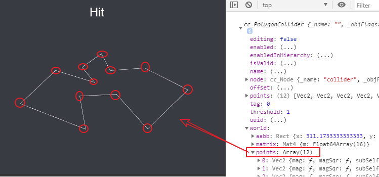 通过打印我们发现多边形PolygonCollider中有个world属性,其中含有多边形碰撞器的所有顶点坐标,如下图所示,Cocos Creator提供了一个Intersection类用于判断点是否在一系列连续点构成的多边形区域内。