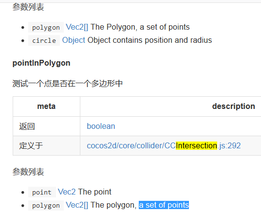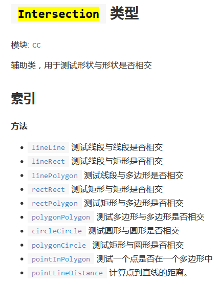在Cocos Creator游戏引擎给我们提供了现成的API可以判断几何形状之间的位置关系。如下图所示: