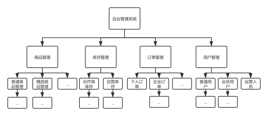 后来随着业务越做越大,商品管理逐渐分成了精选商品管理和普通商品管理,库存管理分成了合作商库存和自营库存,订单管理和用户管理也愈发的庞大,成了这个样子: