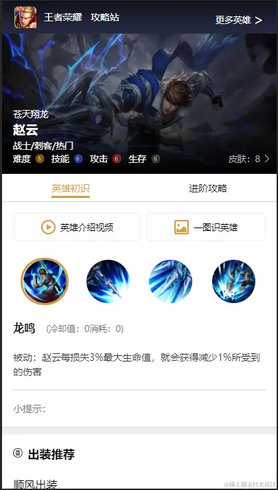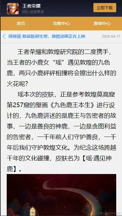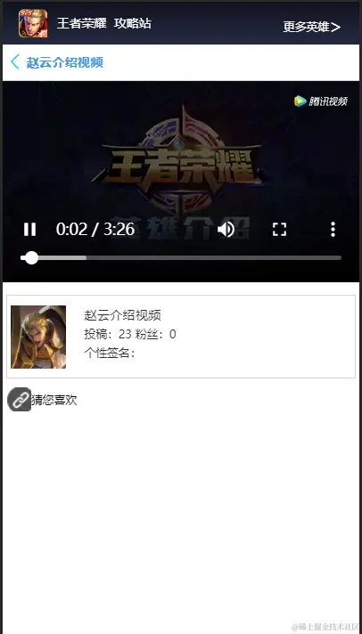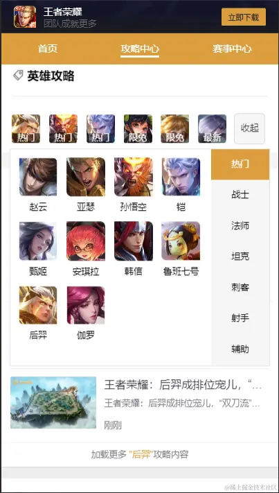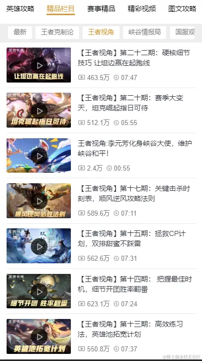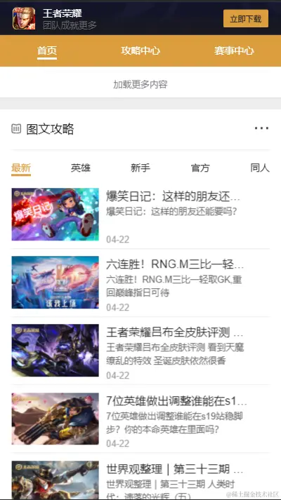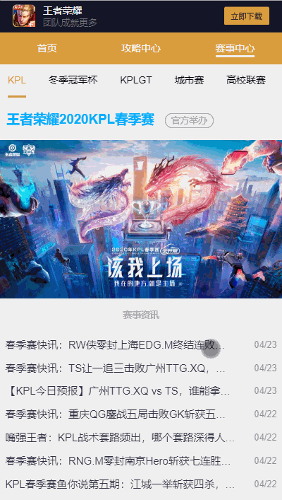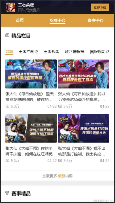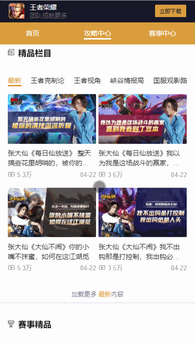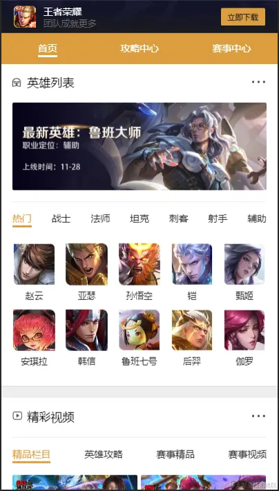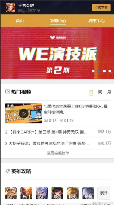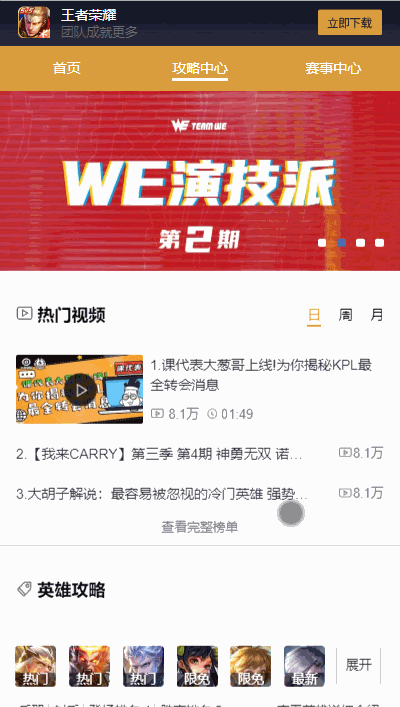 - 攻略中心(英雄攻略、精品栏目、赛事精品、精彩视频和图文攻略5个小模块)及详情页展示和视频播放