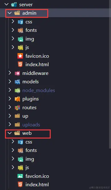 分别在admin和web目录下运行上面的命令,打包后的静态文件分别存放于server目录下的admin和web文件夹下,