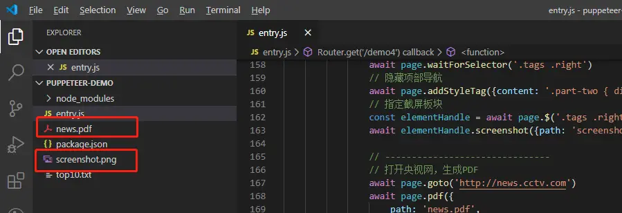 重启服务,浏览器访问http://localhost:7878/demo4,执行结束后,可以看到新生成的screenshot.png和news.pdf
