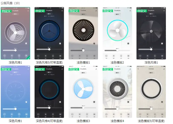 a.公版面板 目前有10套公版面板可供选择。 注意:如果产品带温度功能点,请选择可带温度的模板,避免出现因为扇叶遮挡温度显示的情况;另外底部图标有一定规则和显示优先级:开关>模式>灯光>摆风>定时 底部最多4个按钮,其他功能及自定义按键会放在设置-二级页面。