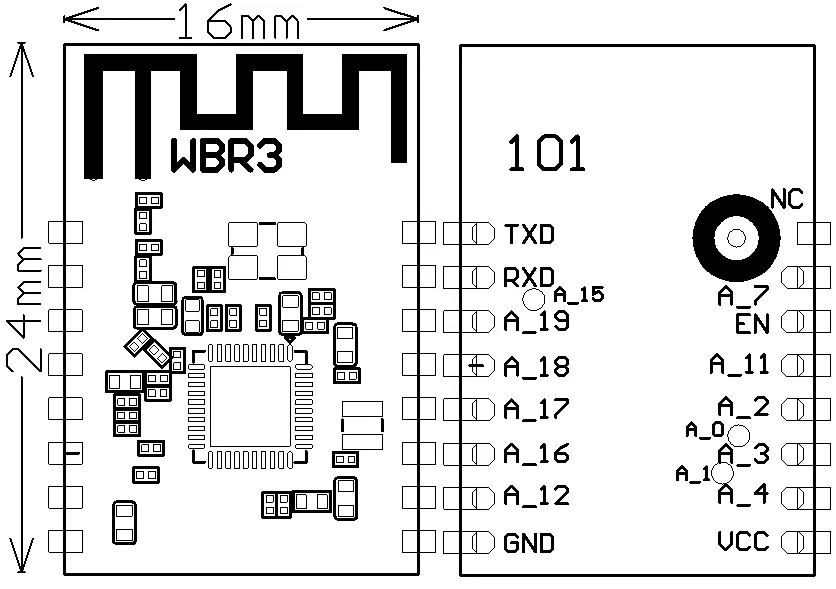 尺寸封装: WBR3 共有 2 排引脚(2×8),引脚间距为 2mm。 WBR3 尺寸大小:16±0.35 mm (W)×24±0.35 mm (L) ×2.9±0.15 mm (H)。WBR3尺寸图如下图所示: