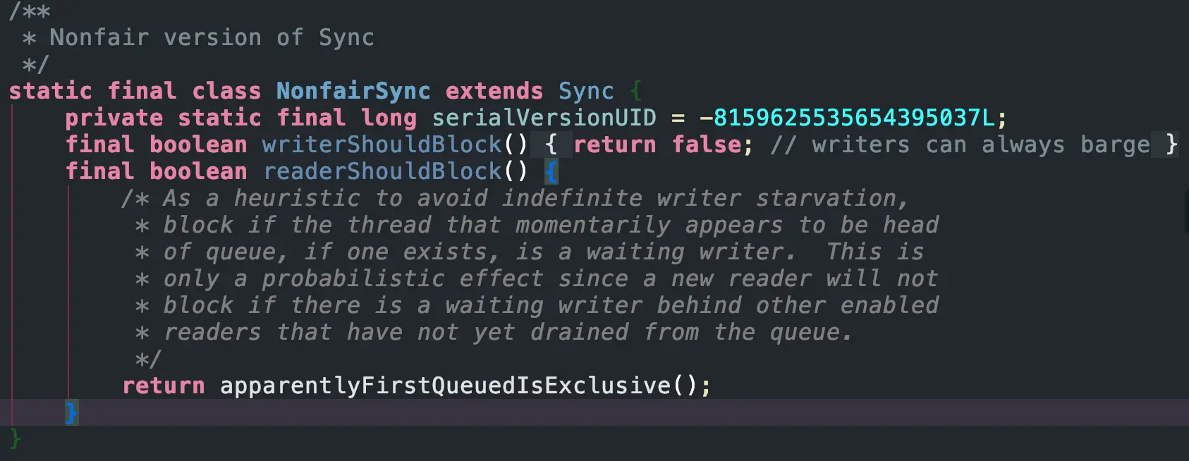 正所谓一山不容二虎,读与写这二虎相争,必有一王。当读写并存时,我们只能取一个,取哪一个呢?读写锁使用场景多为读多写少,如果一个写线程进来,而读线程很多,结果必然是写线程将苦逼的一直等待中,它会因得不到资源而产生饥渴。我们要做的,应该是保证请求写操作的线程不会被后来的读线程挤掉。