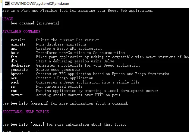 这回终于成功了,生成了一个main.exe可执行文件,执行以下就是bee工具,现在你只需要把这个可执行文件重命名为bee.exe,然后复制粘贴到你的GOPATH/bin 路径下,添加环境变量,然后打开终端,输入bee,神奇的事情发生了,你看: