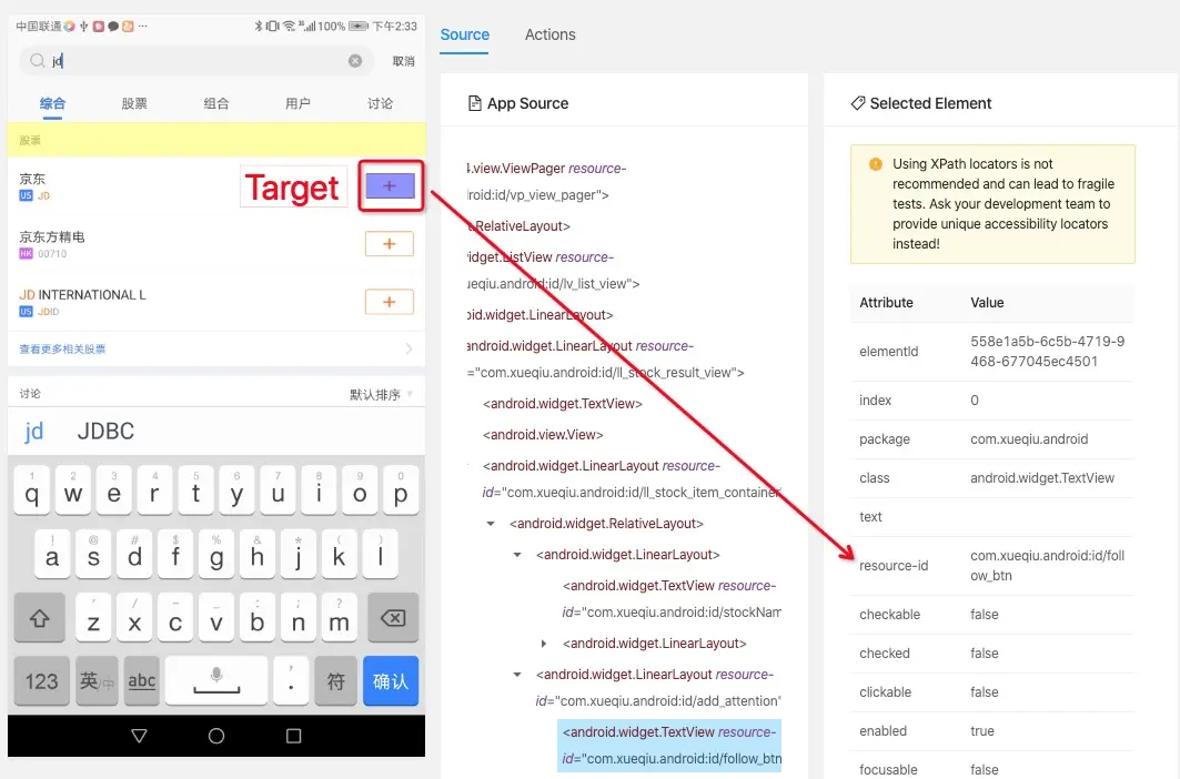 稍安勿躁,在这个例子里面搜索结果这个ListView的每一个添加按钮的id都是follow_btn,当前搜索的内容刚好是出现在第一个位置,所以appium通过id定位返回第一个找到的元素确实是我们要的添加按钮,但如果搜索结果是在第二位或者第三位该怎么办呢?又如果这个控件没有id的情况下该怎么办呢?