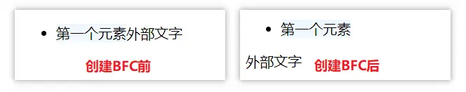 让li的父级元素ul创建BFC后(例如给ul的css属性overflow定义为hidden),由于BFC有隔离作用,就能防止外部的文字环绕。