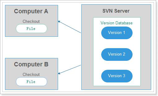 SVN 属于集中式版本管理控制系统,服务器中保存了所有文件的不同版本,而协同工作人员通过连接svn服务器,提取出最新的文件,获取提交更新。