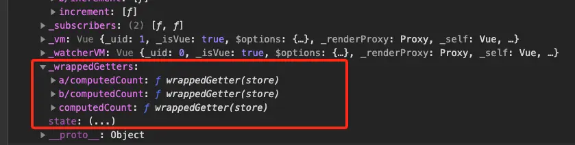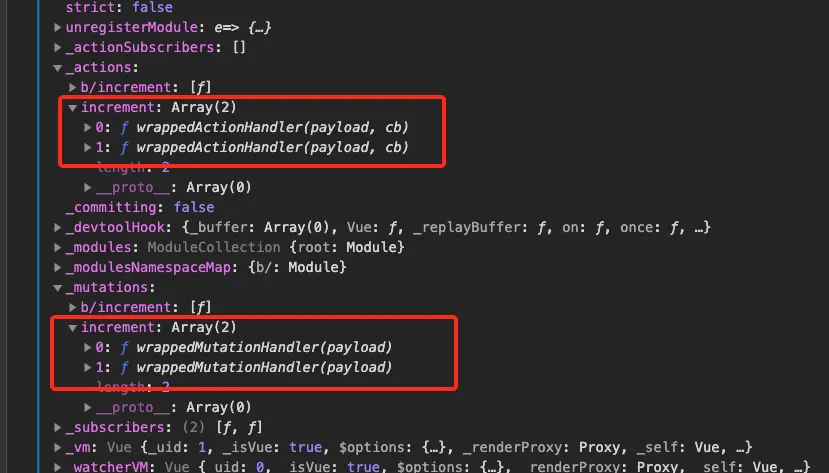 可以看到我们的mutation 和 我们的action 都会push到一个entry的数组中 而我们的getters 是直接把方法取出来赋值给了_wrappedGetters