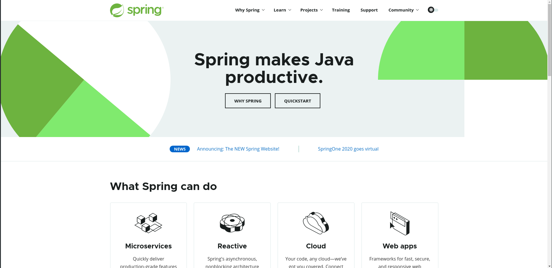 官方网站一般是学习和查阅某种技术资料的首选, spring 也不例外. 前段时间,我惊喜的发现它们的官方网站 改版了, 风格更加清爽轻量,访问速度更快,布局更加条理找文档更加方便了。在这个前端框架层出不穷的年代,我有点好奇 spring 的官网前端和后端分别是用 啥做的, 又有啥亮点呢? 我们来一探究竟。