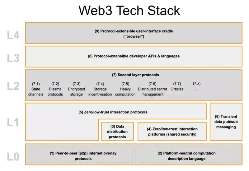 如今的趋势不是开发出一条可以涵盖所有功能的区块链,而是专注于某一具体功能,这个逻辑与如今的互联网协议堆栈不谋而合。互联网并非一个包罗万象、庞大单一的协议,而是由各种协议组成的, 每个协议都负责一个具体功能。协议堆栈通过分工合作的方式实现优化,并减少每一层协议受到的攻击强度,以此降低风险。