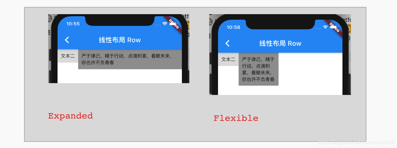 不同之处是Expanded会强制填充剩余留白空间,而Flexible不会强制填充。如下图所示。