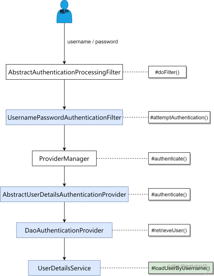 如下图,是密码登录的流程图,其中「蓝色框」是扩展登录需要重新写的,通过重写Filter获取认证用户,重写Provider和UserDetailsService给用户授权。