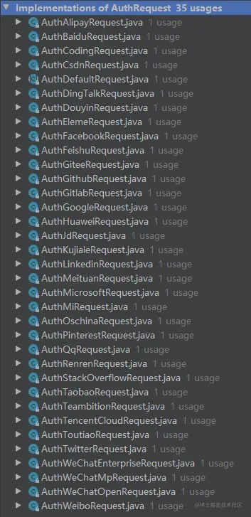 来一张JustAuth实现类的截图,大家感受下,集成了市面上的大部分登录,像QQ、微信、微博、淘宝、百度、github、码云等等。只需要配置一下,即可集成第三方登录,很是方便。