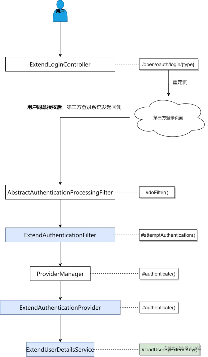 可以看出,扩展第三方登录,与密码登录的流程基本一致,在获取登录参数、查找用户信息时,略有不同。再梳理一下第三方登录的流程图,方便大家理解。