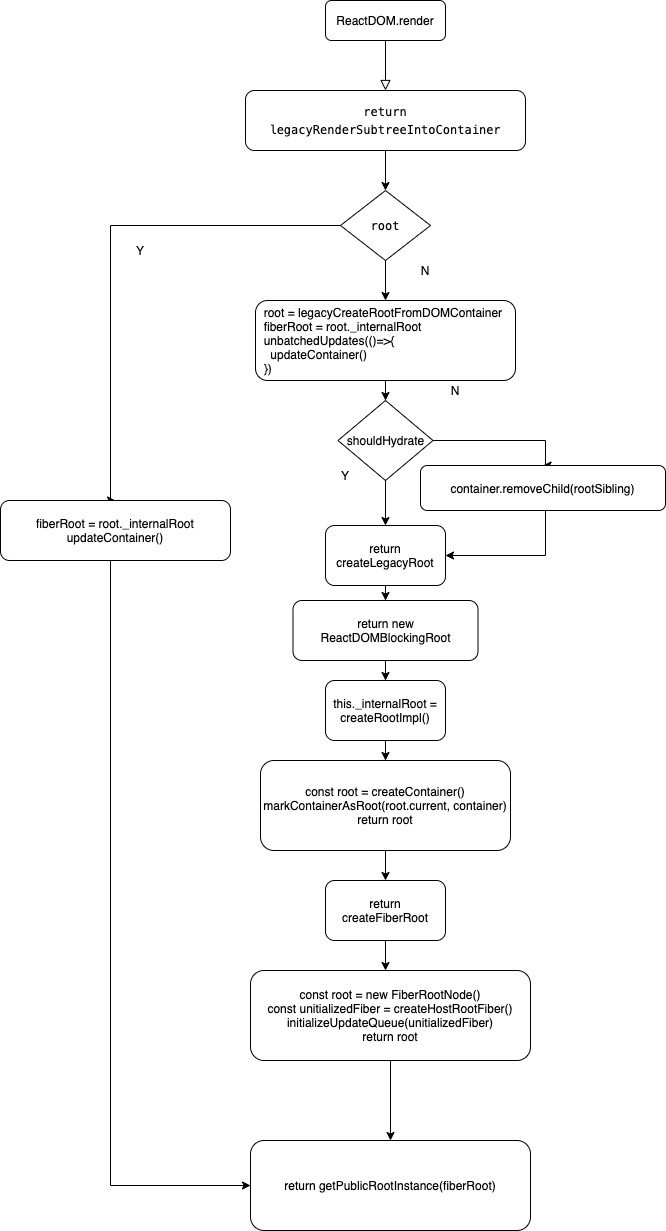 - 判断是否为初次渲染,如果是就创建root并将root._internalRoot赋值给fiberRoot同时封装callback回调,然后调用unbatchedUpdates立即更新子节点。