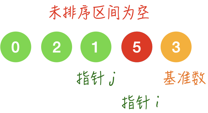 5 > 3, 所以 5 要放在右区间里,所以 5 和 j 指向的 0 交换一下: