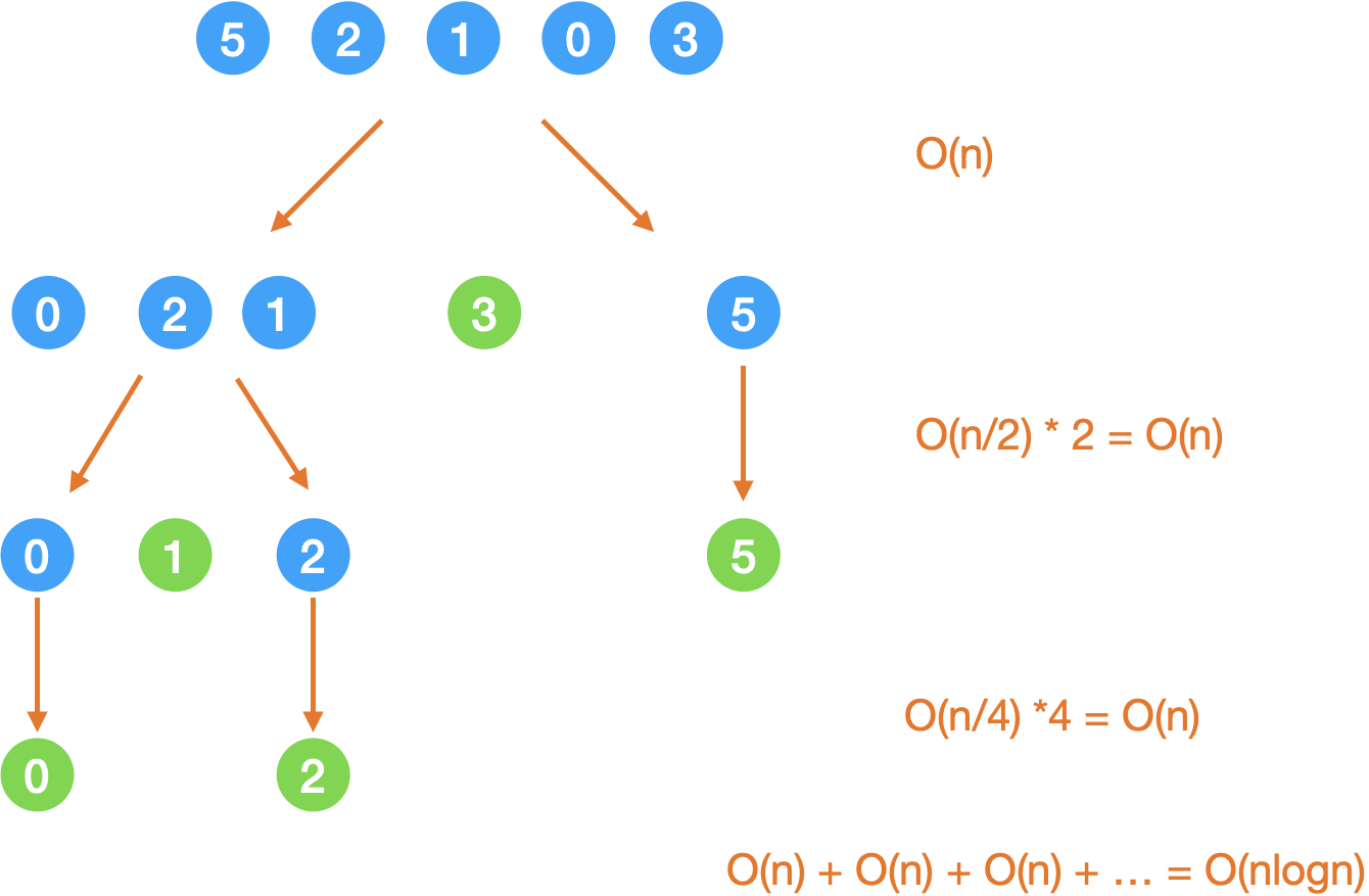 就是最开始描述的方法,直到每个区间内没有元素或者只剩一个元素就可以返回了。