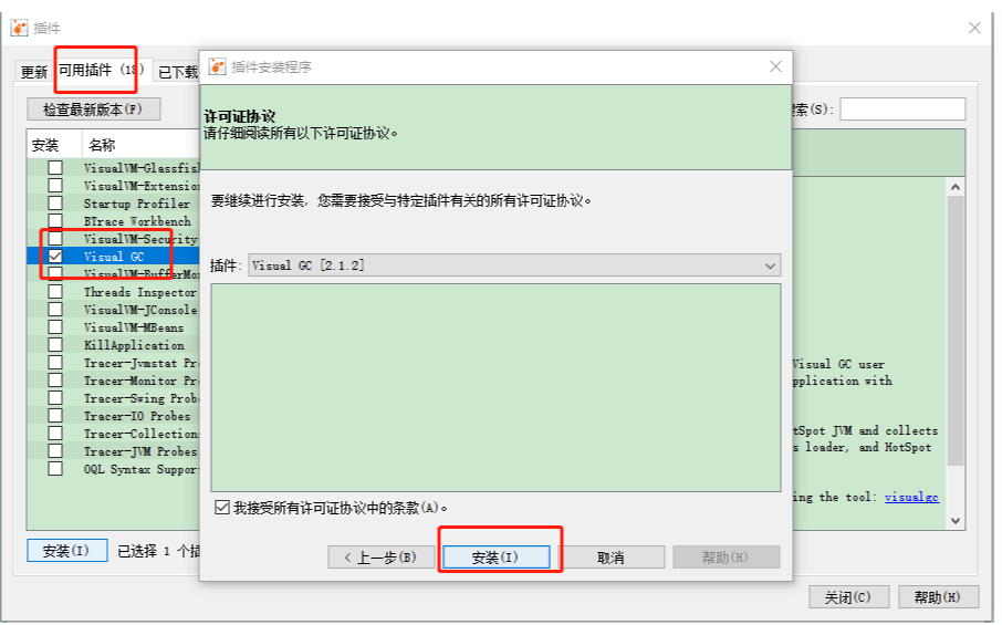 2、进入 jvisualvm,点击 -》工具 -》插件 -》 可用插件,勾选visualgc,接受协议安装即可。