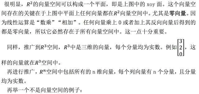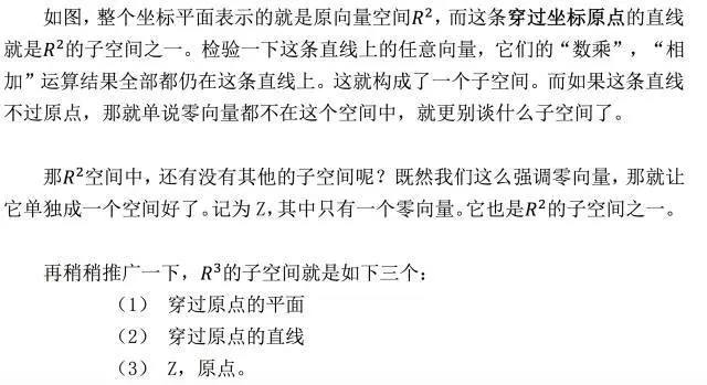 首先明确“向量空间”的概念,它表示一整个空间的向量,但是要注意,不是任意向量的集合都能被称为向量空间。所谓的向量空间,必须满足一定规则, 就是:该空间对线性运算(相加,数乘)封闭。类似:v → 3v 或 v,w → v+w 运算,若得到的 3v 或者 v+w 都仍然在此空间中,那么这个空间可称为向量空间。
