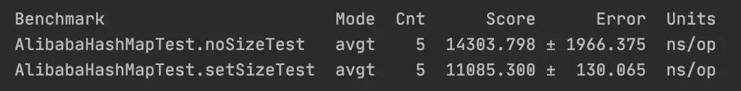 从上述结果可以看出,设置了大小的 HashMap 的性能约是没有设置大小的 1.29 倍。