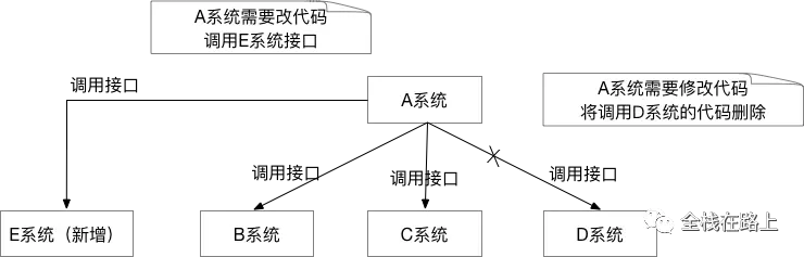 A系统需要频繁的更改代码,这显然不是一个好的设计,使用MQ可以解决这个问题。