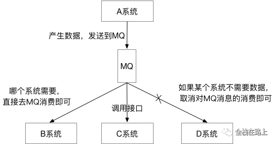 通过消息队列可以让数据在多个系统之间进行流通,数据的生产方不用关心谁来使用数据,只需要将数据发送到消息队列,数据使用方直接在消息队列中直接获取数据即可。