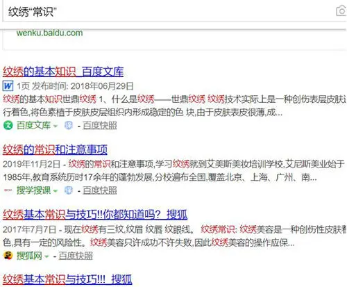 怎么找行业网站?我交给你们一个方法,在百度上搜索产品词+“行常识”,例如纹绣“常识”,这样去百度上搜索,会出现很多常识类的文章。如图: