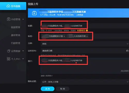 视频做完之后就是发布视频,发布视频技巧在于标题、描述以及标签上的长尾词。因为我们做视频引流主要通过长尾词引流。所以你首先手里要挖掘大量的长尾词,而长尾词就是标题。