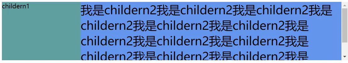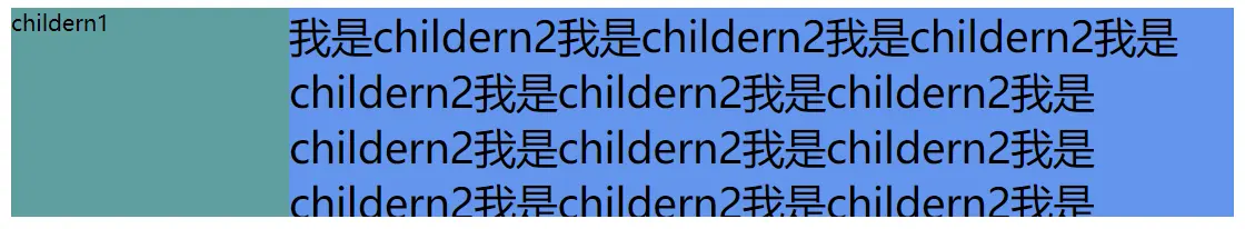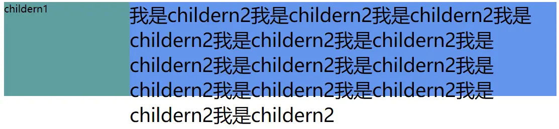 <!DOCTYPE html> <html lang="en"> <head> <meta charset="UTF-8"> <meta name="viewport" content="width=device-width, initial-scale=1.0"> <title>BFC</title> <style> .father{ } .childern1{ height: 150px; width: 200px; background-color: cadetblue; float: left; } .childern2{ height: 150px; background-color: cornflowerblue; font-size: 30px; } </style> </head> <body> <div class="father"> <div class="childern1">childern1</div> <div class="childern2">我是childern2我是childern2我是childern2我是childern2我是childern2我是childern2我是childern2我是childern2我是childern2我是childern2我是childern2我是childern2我是childern2我是childern2</div> </div> </body> </html>效果如图: