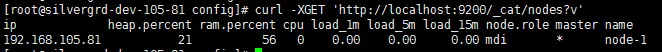 curl -XGET 'http://localhost:9200/_cat/nodes?v'查看es节点状态