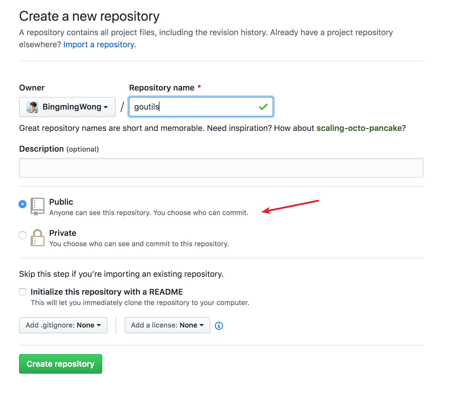 先在你的 Github 上新建一个仓库,记得选 Public(默认)