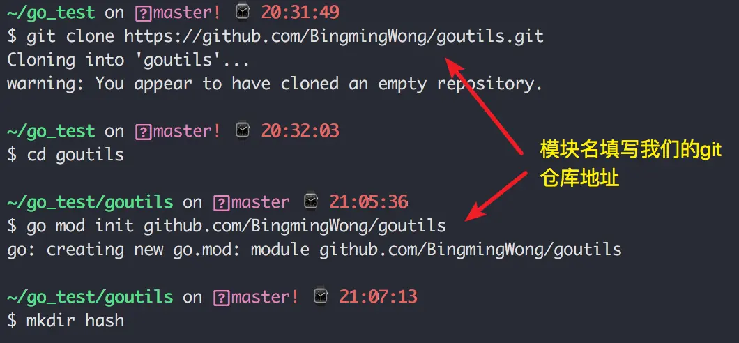 使用前面学过的 go mod init 命令进行初始化,注意这里的模块名,填写我们的git仓库地址(但是要去掉.git哈)
