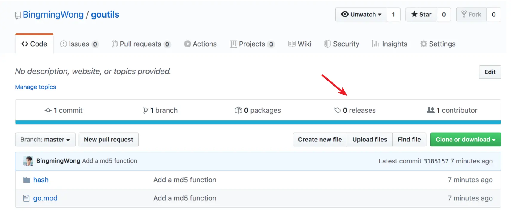 $ go mod init github.com/BingmingWong/goutils然后新建一个 hash 文件夹,存放编写的一个计算 md5 值工具包,编辑 md5.go