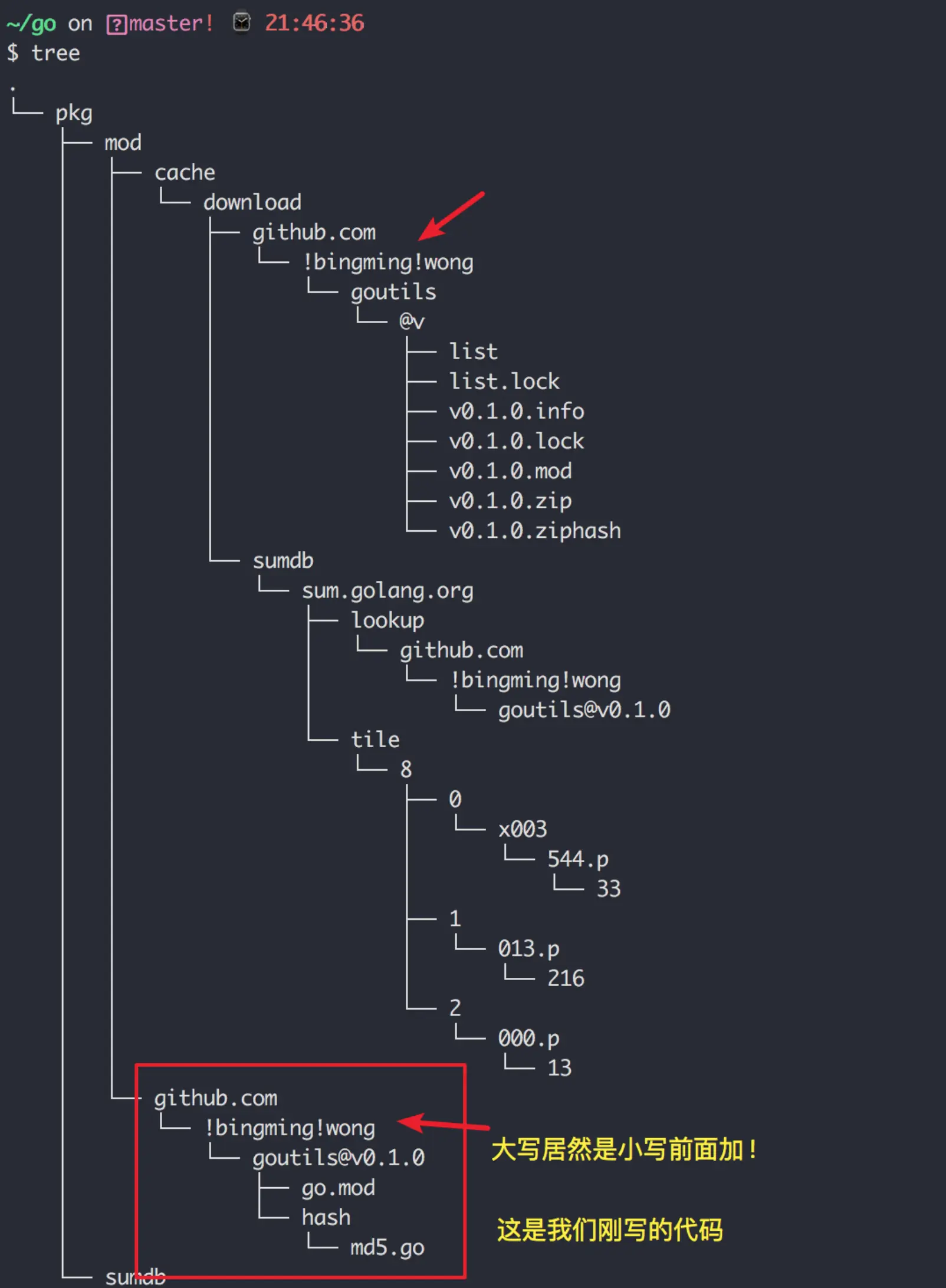 再使用 tree 命令,查看一下我们下载的包已经放入了 $GOPATH/pkg/mod 下。