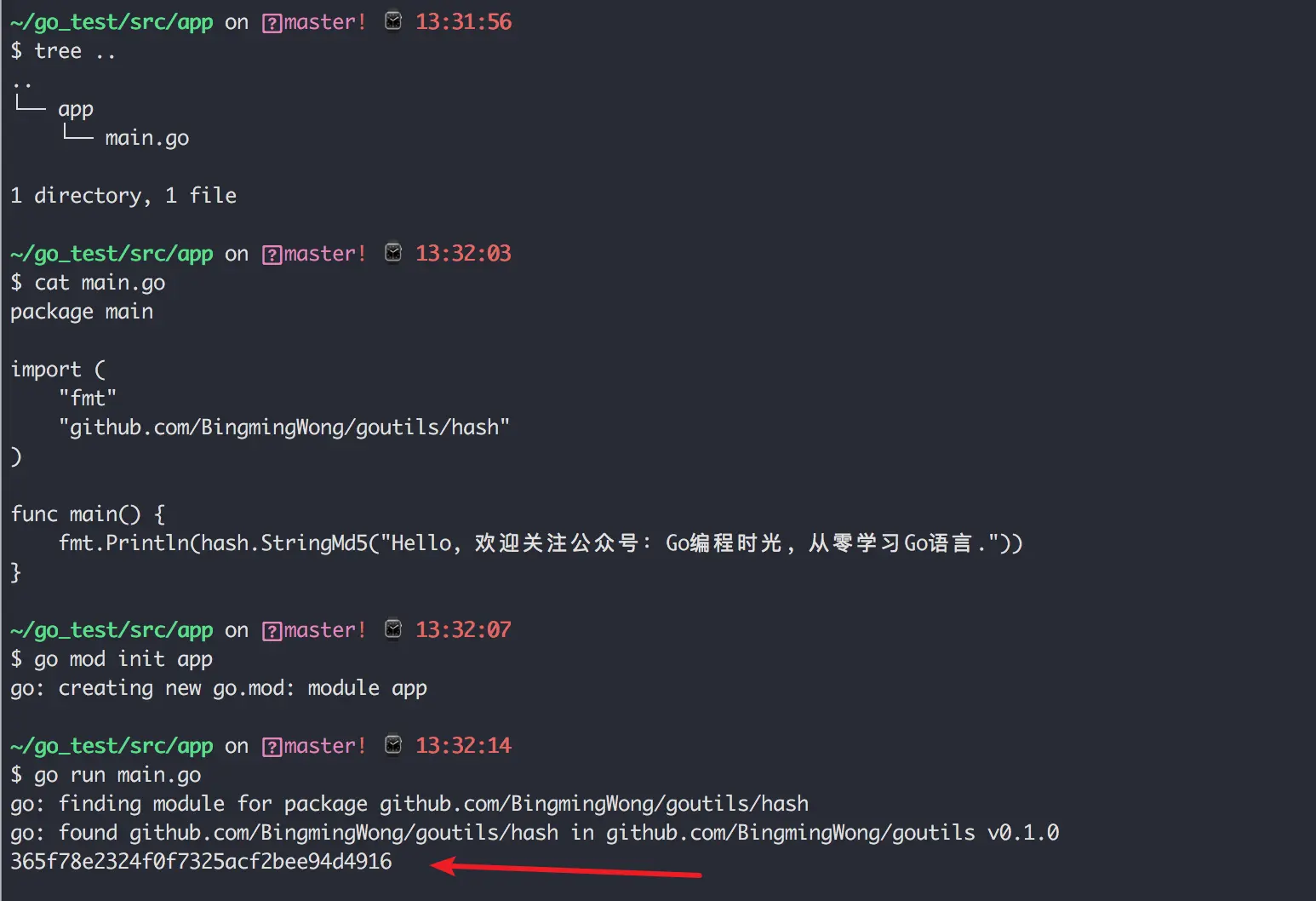 下载下来后,我们试着去调用一下他的函数,有一点需要注意的是,在这个示例里,你不能使用 github.com/BingmingWong/goutils 去导入,因为在这个目录下并没有 package,所以你必须导入 github.com/BingmingWong/goutils/hash 。
