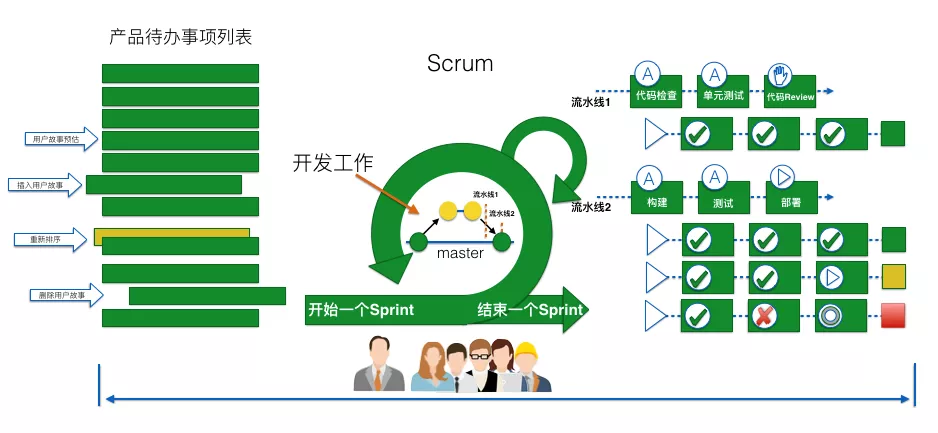 我们要为了这个全局的目标进行优化,让价值稳定的、持续的流动起来。比如:通过持续管理产品待办事项,让研发团队每个sprint有目标,并且这个目标和公司的目标相吻合。再比如:通过持续集成、持续部署缩短变更到上线所需的时间,同时提高服务的稳定性。