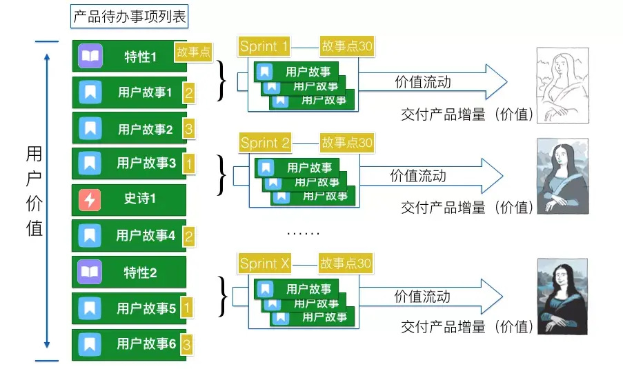 如果基于精益思想看Scrum,那么每一个产品待办事项就代表着一个用户价值,而每一个sprint就是一次价值流动的过程。在一个sprint开始时,我们定义这个sprint的产品增量目标,按照产品待办事项的优先级,选取价值相对较高的一些用户故事放入这个sprint中。在这个sprint结束时,我们交付产品增量,交付用户价值。随着一个又一个sprint的开始和结束,我们可以稳定的、持续的让价值流动起来