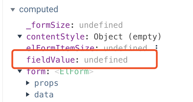 el-form-item的实例,然后再打开form-item组件的源码,找到validate函数,其中使用到了async-validator这个库,这个库可以验证prop是否符合我们定义的规则,具体可以自行了解。另外还有一行关键代码model[this.prop] = this.fieldValue;,这说明prop的值用的是fieldValue的值,在组件里搜了一下fieldValue可以知道,fieldValue是一个计算属性,其中涉及到一个方法getPropByPath,这个我们后面在看,先在DevTool查看fieldValue的值,我们发现,fieldValue为undefined