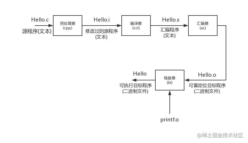Hello.c 经过预处理,编译,汇编,链接,最后生成了一个可执行的直接二进制文件的过程。