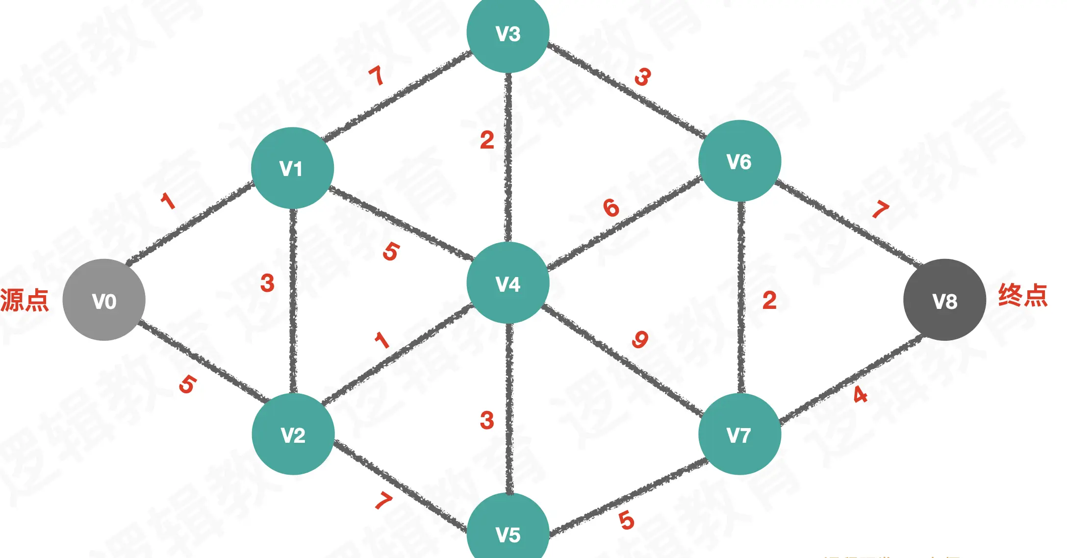 再以V6=7为起点,得到最终的最小路径的权值16: