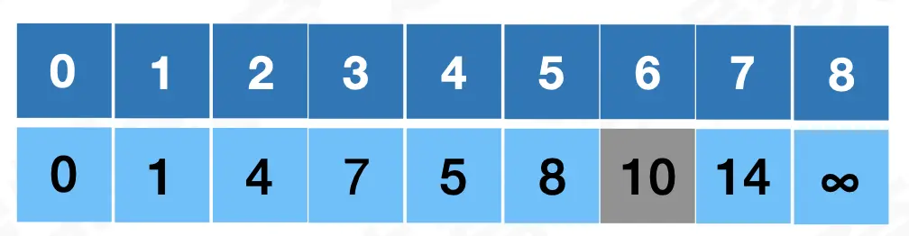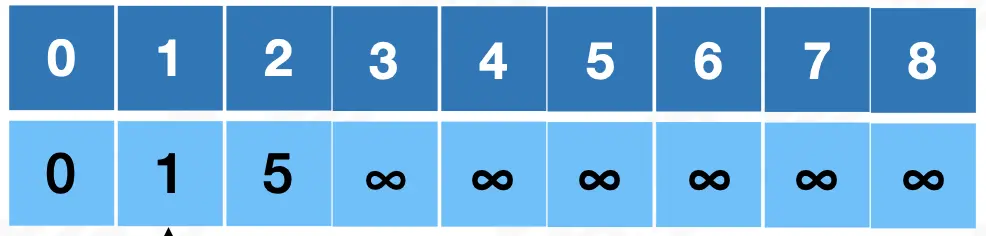 从表格中可以看到,V0 到 V1 的距离最近,所以迪杰斯特拉算法设定 V0-V1 为 V0 到 V1 之间的最短路径,最短路径的权值和为1。 -