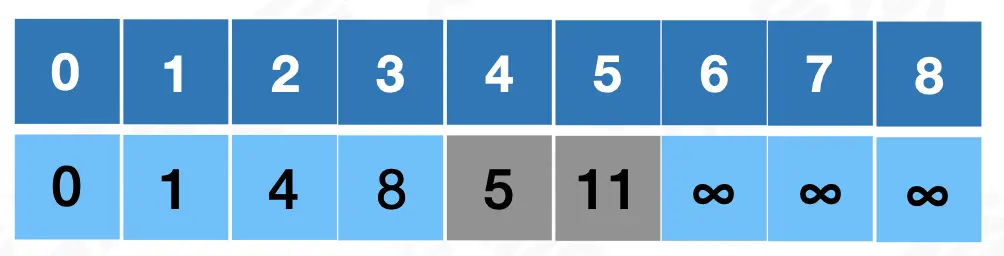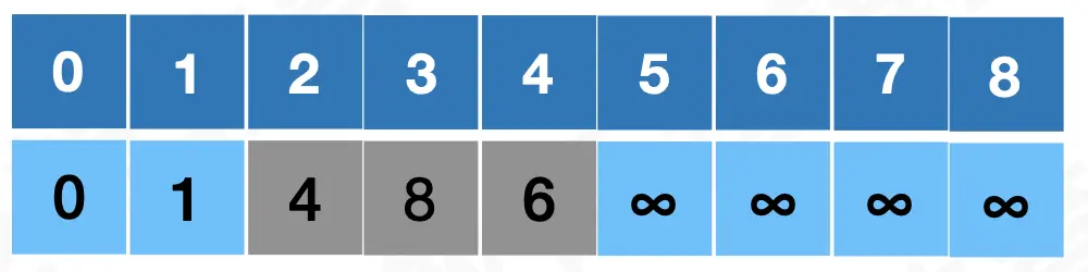 已经判断 V0-V1 是最短路径,所以以 V1 为起始点,判断 V1 到除了 V0 以外的其余各点之间的距离,如果对应的权值比前一张表格中记录的数值小,就说明网中有一条更短的路径,直接更新表格;反之表格中的数据不变。可以得到下面这个表格: