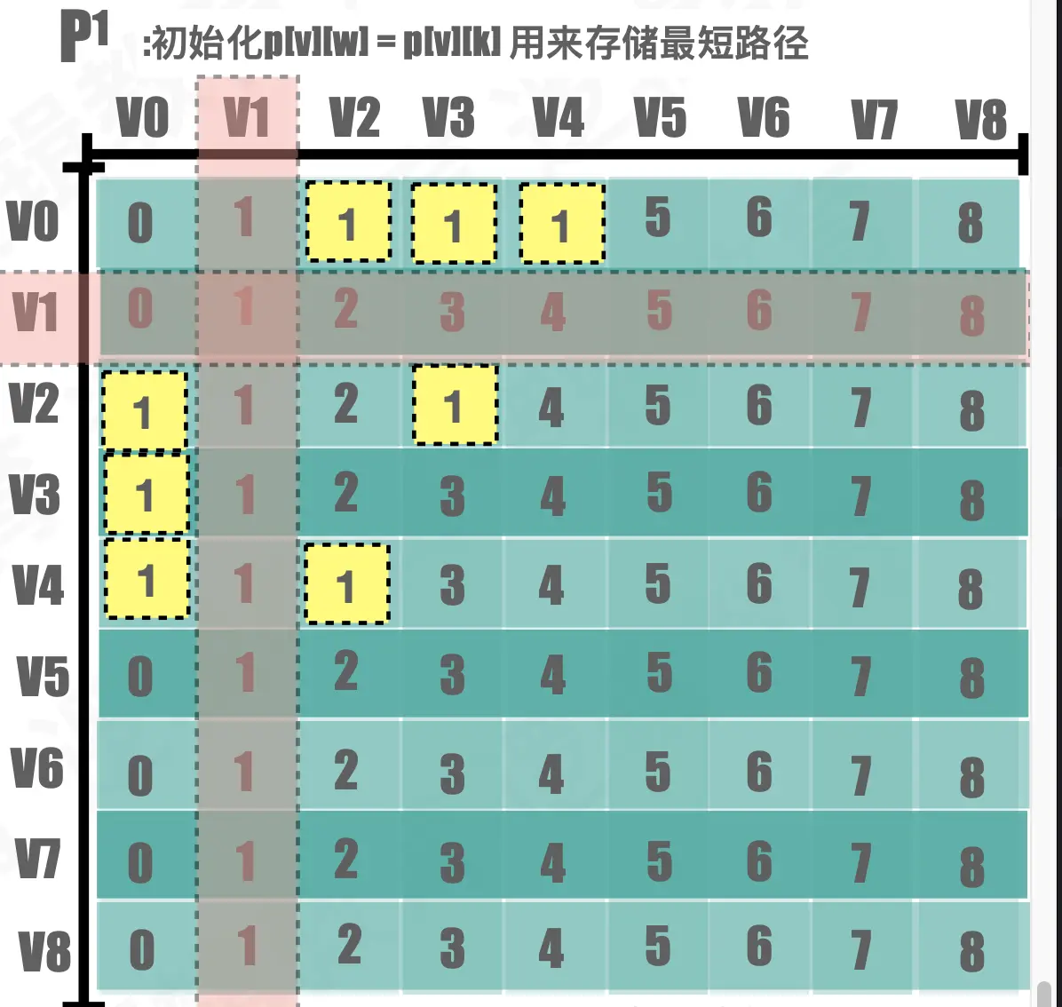 通过V1的中转,V0与V2,V3,V4 之间的建立了连接,更新路径权值为4,8,6。V2与V4之间的最短路径权值,由于Dis(V2,V4)<Dis(V2,V1)+Dis(V1,V4),所以就没有更新。 通过V1的中转,V0与V2,V3,V4 之间的建立了连接,更新P[0][2],P[0][3],P[0][4]的值为1。 3.如此循环遍历,知道遍历到V8,各个顶点之间的最短路径.