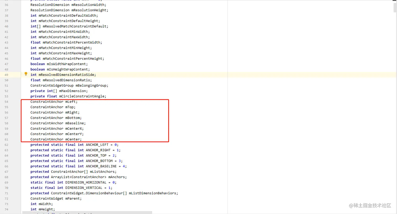 看执行过程,onLayout的时候并没有复杂的位置计算,此时数据已经出错了。所有的参数是从ConstraintLayout.LayoutParams中一个ConstraintWidget对象取的,这个对象是干什么的呢? 我们来看一下ConstraintWidget的成员,从名字和数据类型上看都是各种距离长宽,值得注意的是这几个: